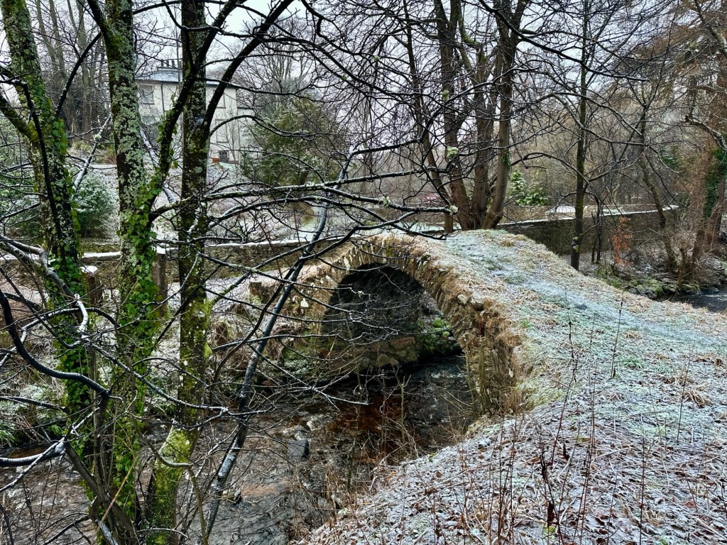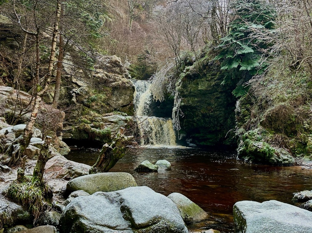 Heading back along Kingsfield Road, continue into town until you reach the road called Howieslap on your left. Turn down here and walk straight on, when you come to wooden sheds you will see a grassy track. Follow the track right to reach a footbridge over Tuach Burn.